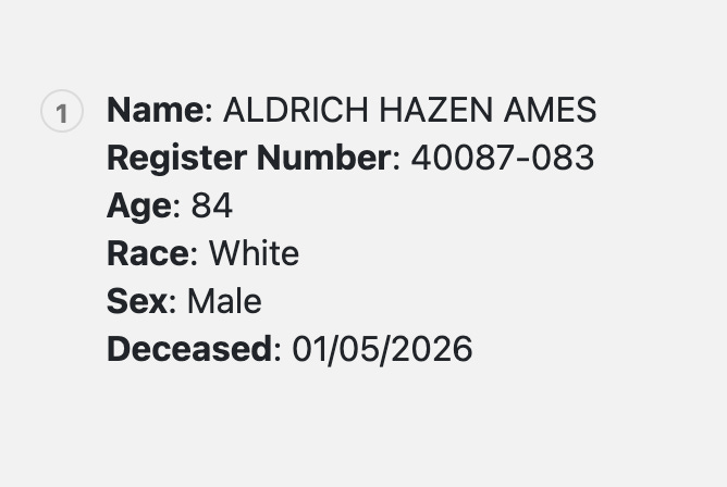 Ames was convicted of espionage in 1994 and had been serving a life sentence at the Federal Correctional Institution in Cumberland, Maryland. His death is confirmed on the Bureau of Prisons website.