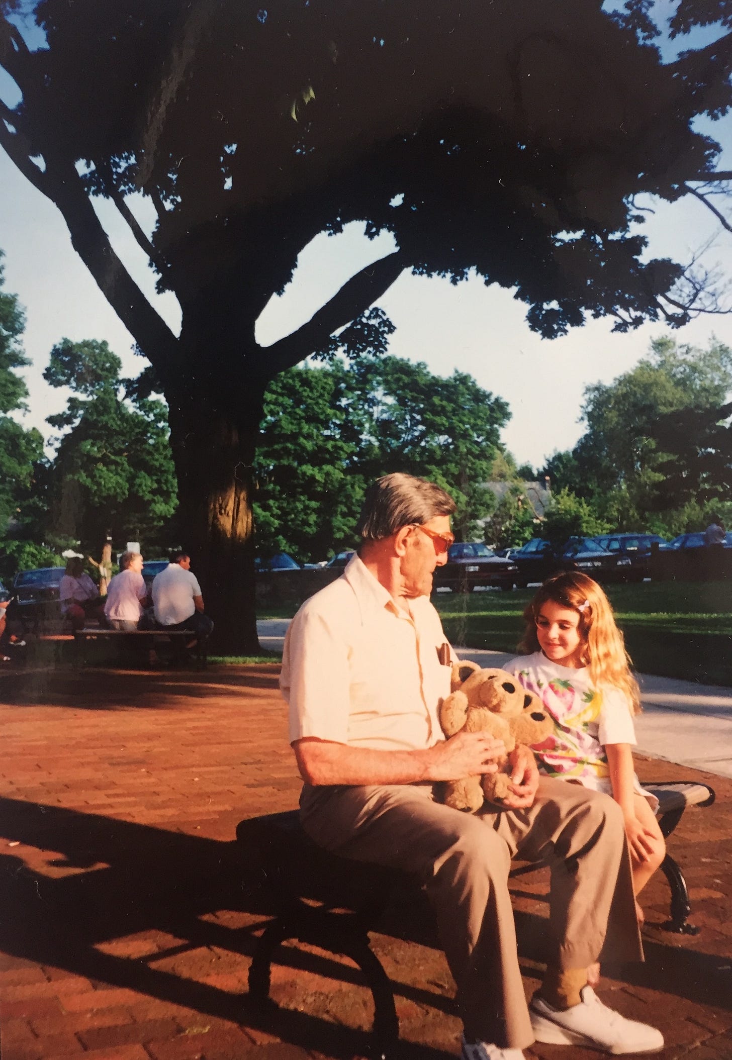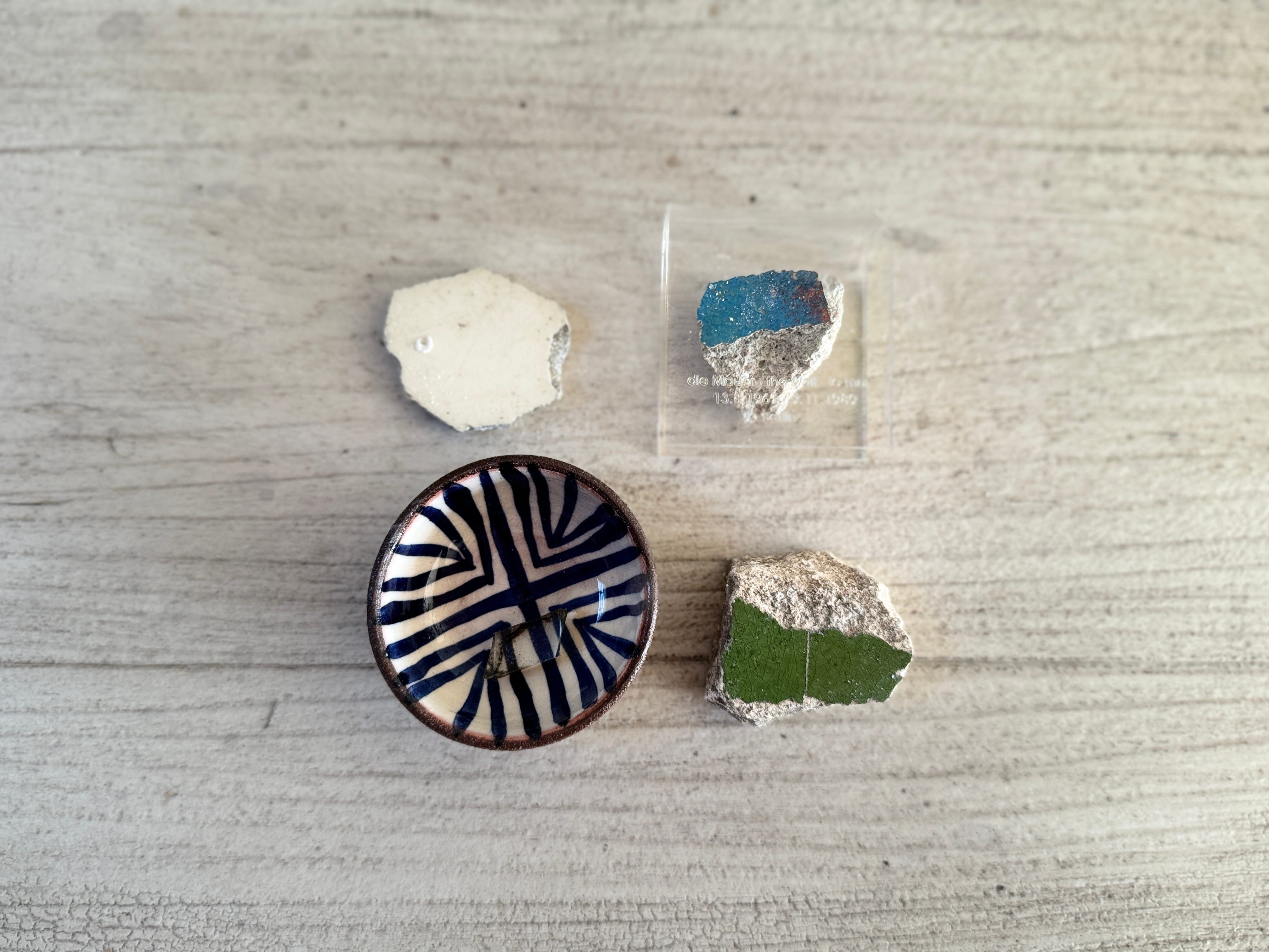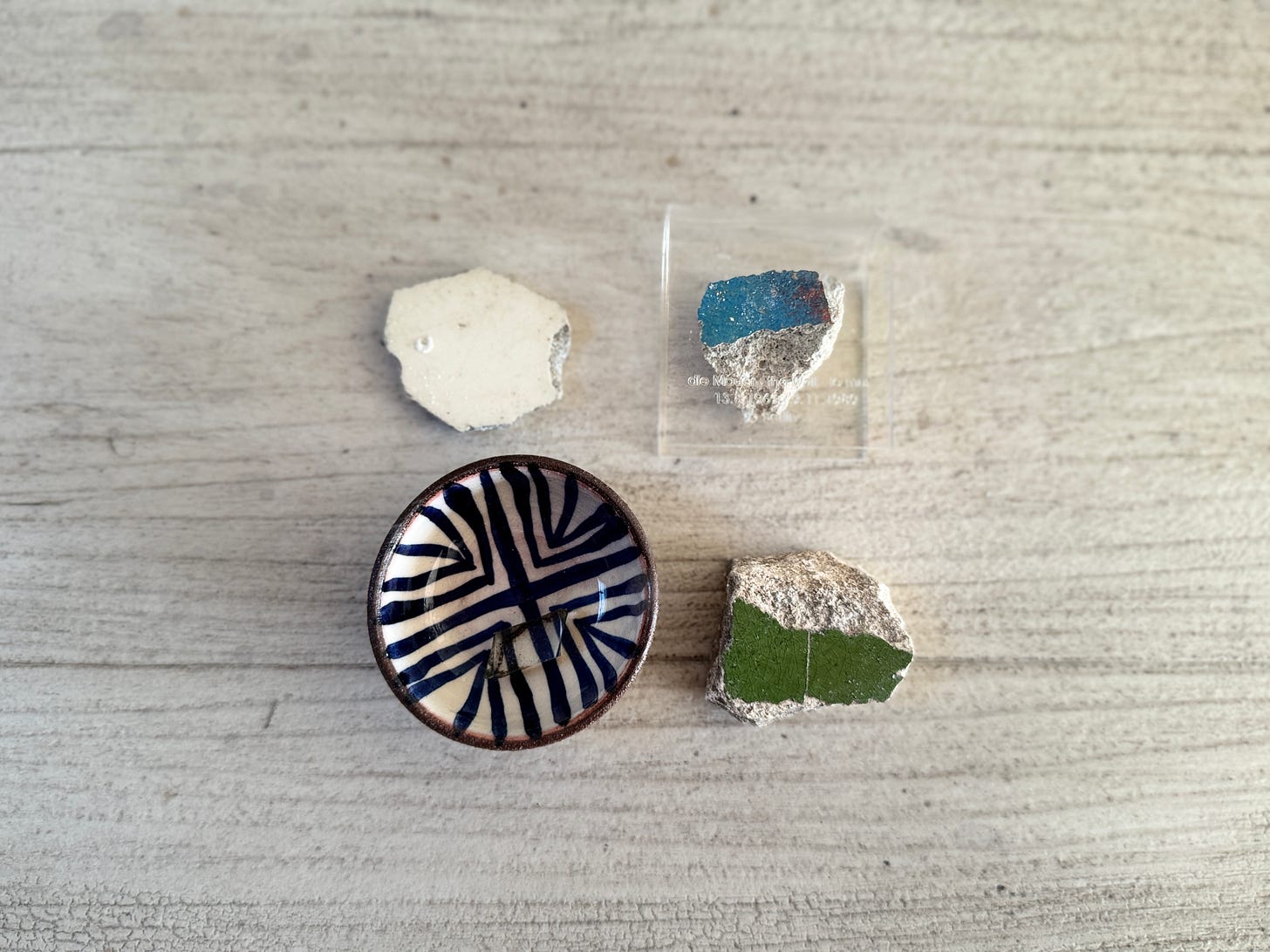 Two other shards come from the tiles at Buchenwald, one of the largest concentration camps that the Nazis built in central Germany. My grandfather was imprisoned there, severely beaten on his head, and experimented on. The doctors wanted to know how wounds responded to radiation. And I’ll tell you — because decades later, I watched my mother gently spread fresh bandaids over his bloody, hairless head for 12 years. The frequent exposure to x-rays caused a lot of skin cancer and sorrow. Sometimes he wore a wig to cover up the damage. He also indulged a girly girl, letting me paint his fingernails and play his padded fingertips like a piano, imitating the sounds of the keys as I laughed. I can’t remember the moment I learned about his imprisonment or the murder of so many members of my family. But I do remember him crying in his seat at a movie theater when we went to see Schindler’s List.